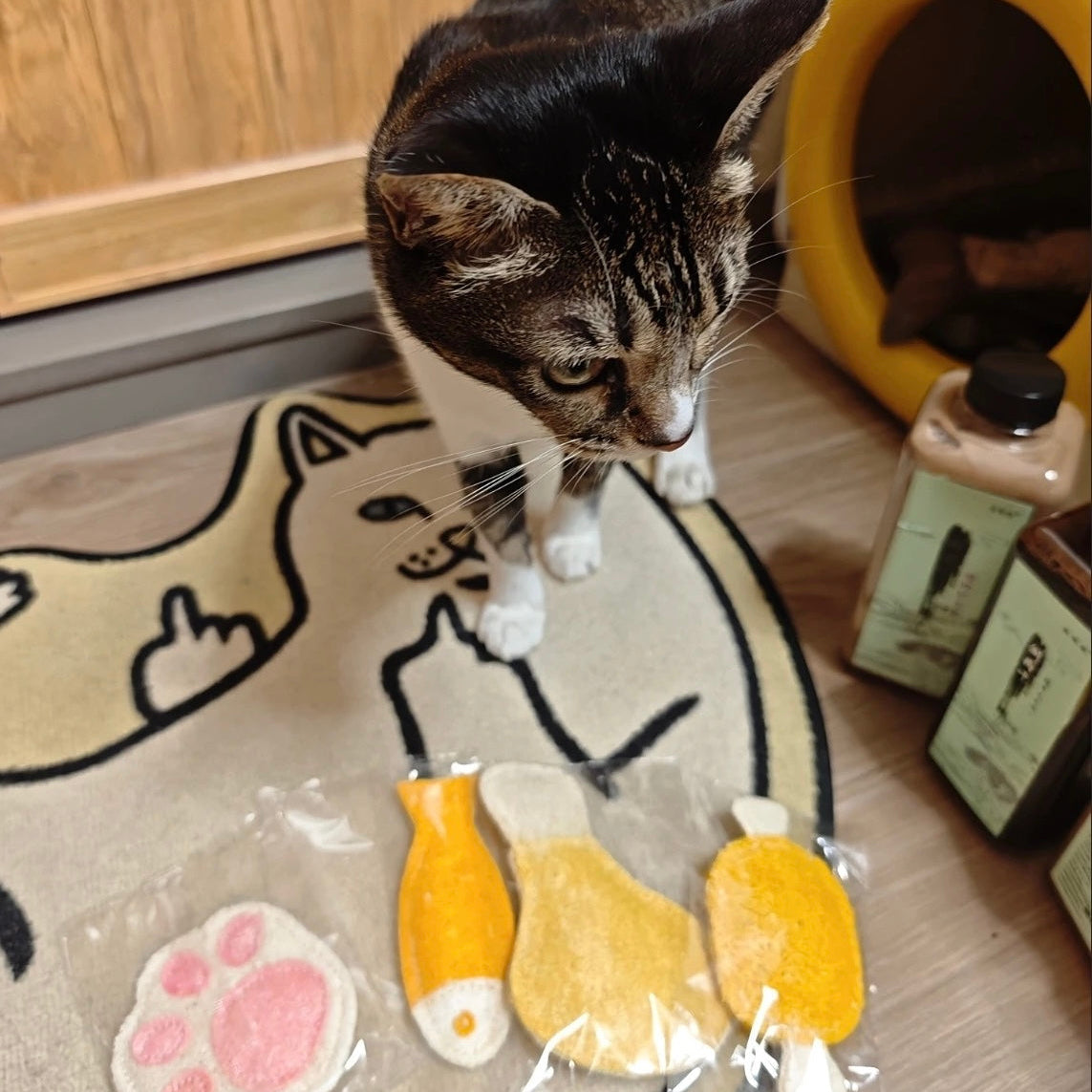 From skeptical to impressed.I wasn't sure if my lazy cat would even look at a piece of loofah, but the reviews convinced me. I'm so glad I tried it! He perked up as soon as I took it out of the package. He now initiates play by bringing it to me. It's become his favorite naptime cuddle toy, and he gently chews on it while he's snoozing. A simple, brilliant product.